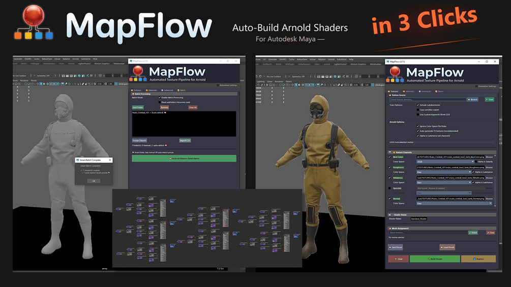 MapFlow is a professional tool for Autodesk Maya that automatically builds, connects, and configures Arnold shaders at scale.