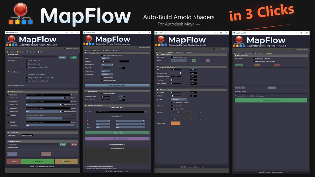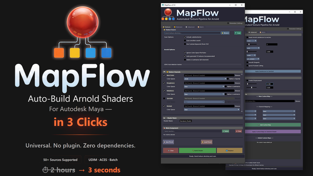 ✔ MapFlow v3.9.x (Full Version) ✔ High-speed Batch Shader Automation ✔ Custom Naming System (CSV Mapping) ✔ Production-Ready Arnold Networks ✔ ACES + UDIM Support ✔ Automatic TX Generation ✔ Installer + Documentation (EN/FR) ✔ Lifetime Updates + Support